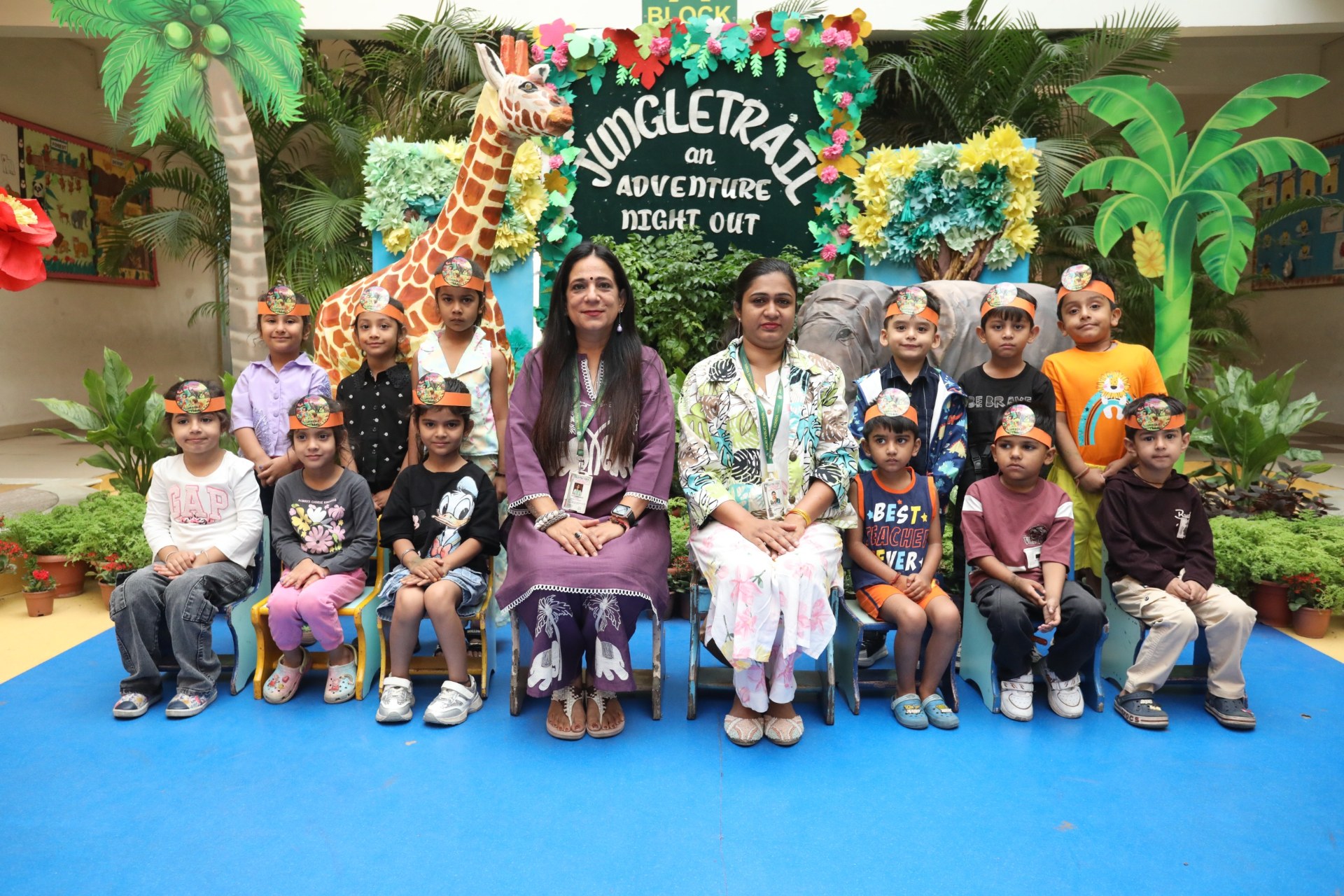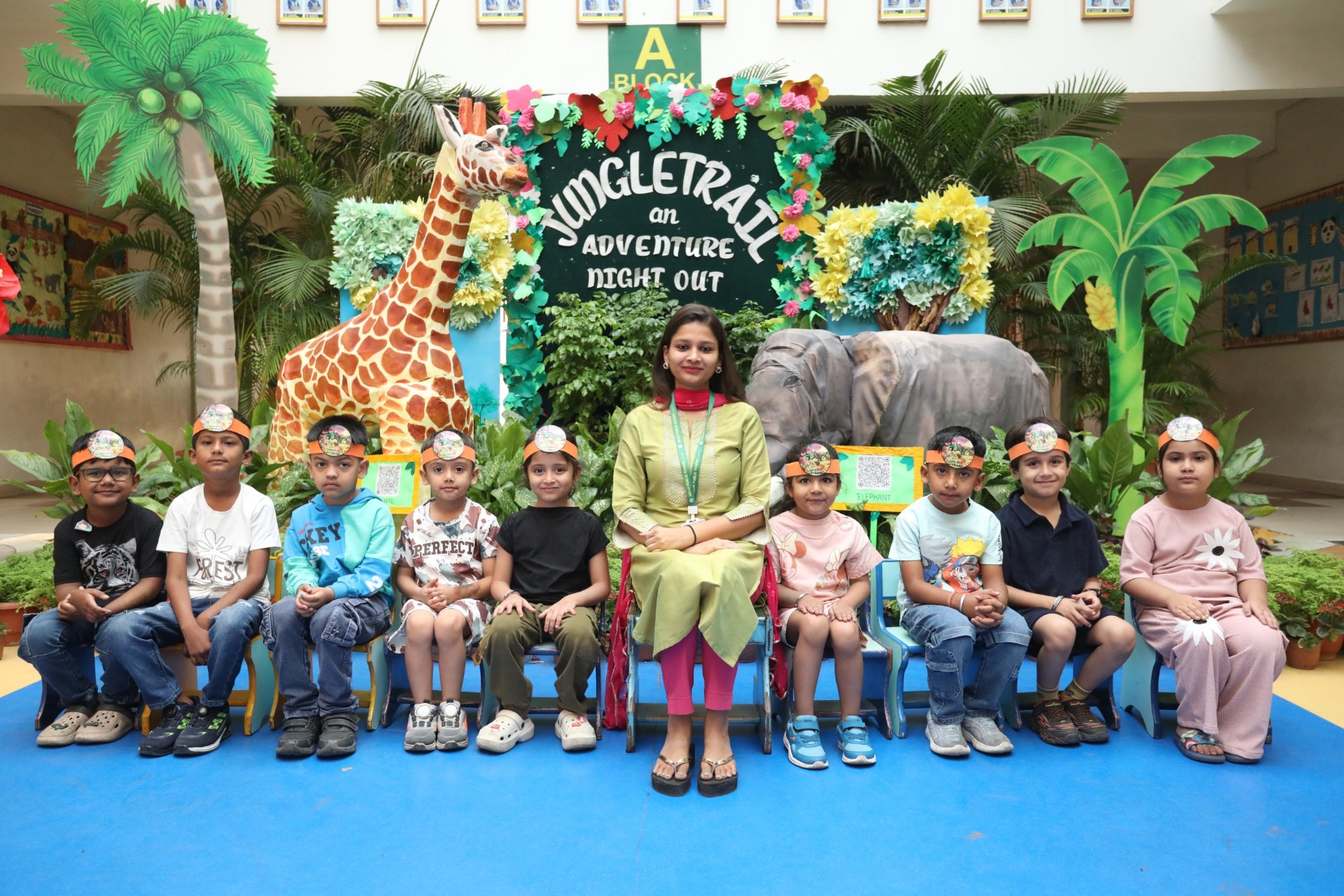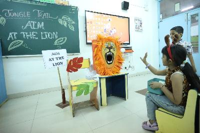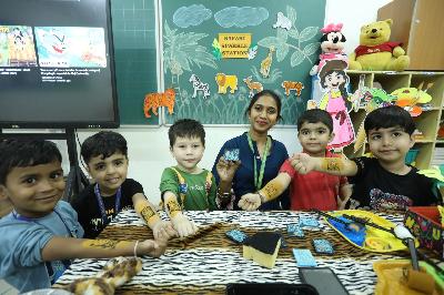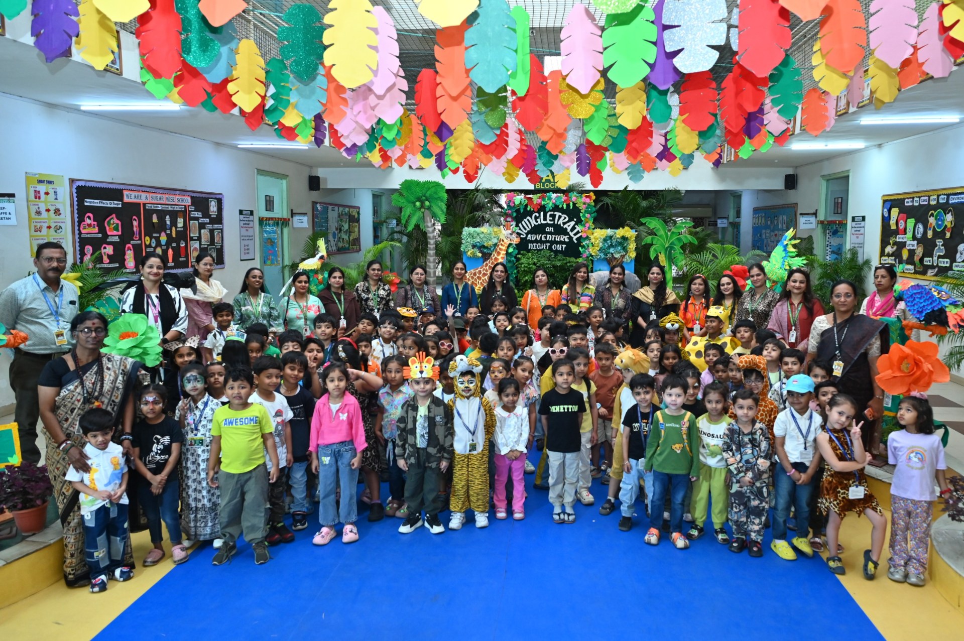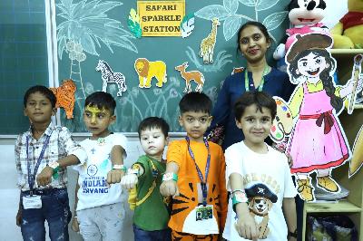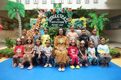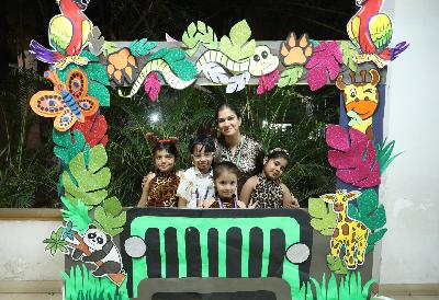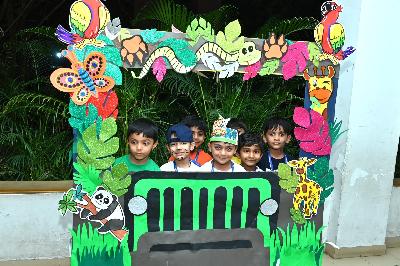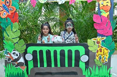 The campus was beautifully transformed into a vibrant jungle setting with green drapes, trees, animal cut-outs, jungle sound effects and soft lighting that created a magical forest ambience. The students were thrilled to see their school turn into a lively jungle and many arrived dressed as explorers and forest animals, which added to the excitement. The evening began with a warm welcome by the teachers followed by engaging activities such as Aim at the Lion, Crossing the River Challenge, hand band and tattoo making, puzzle solving, jungle expedition, shadow play and star gazing along with an energetic DJ session and bonfire.