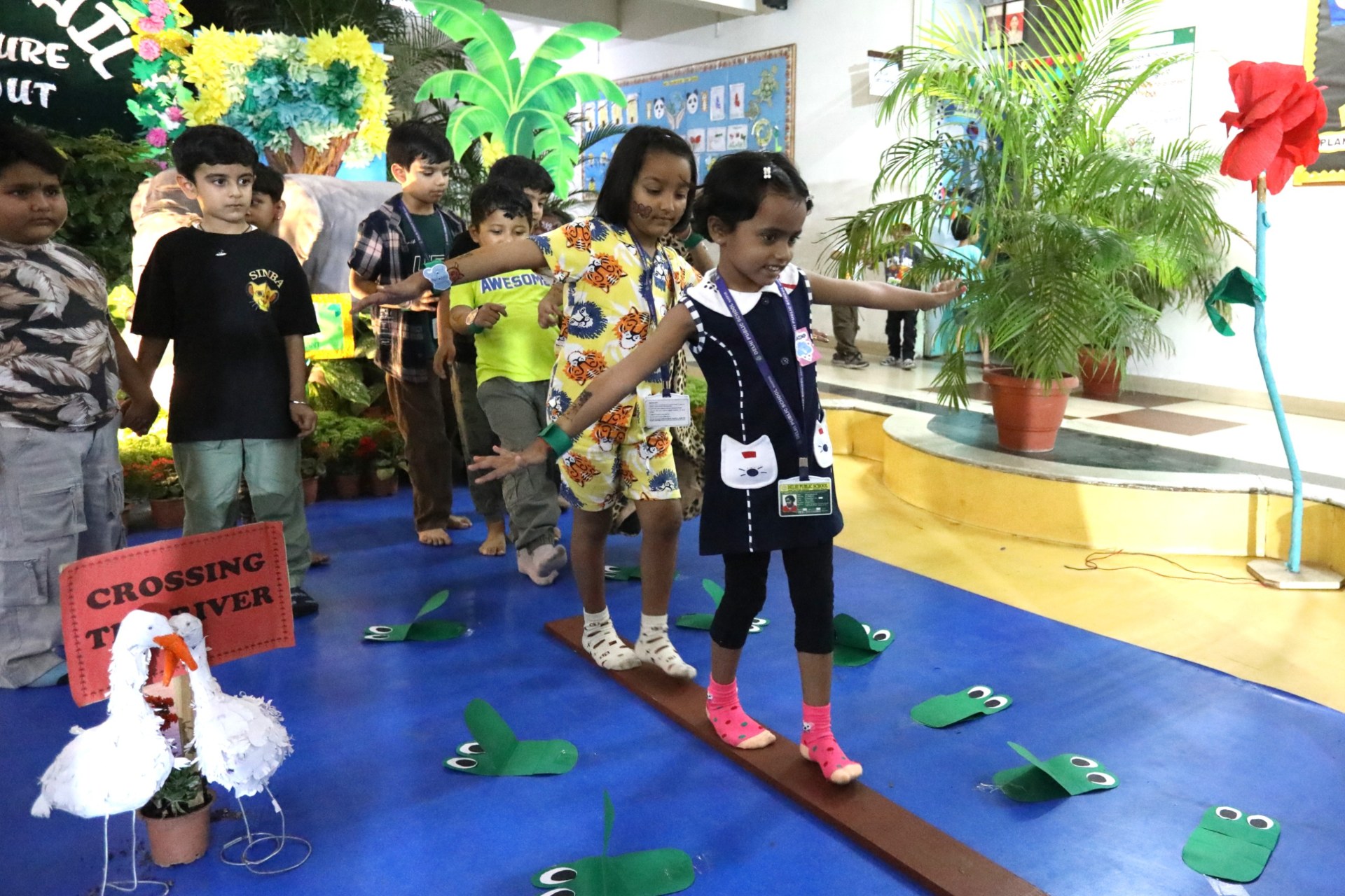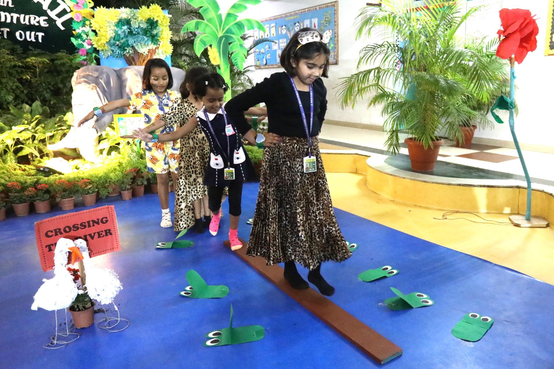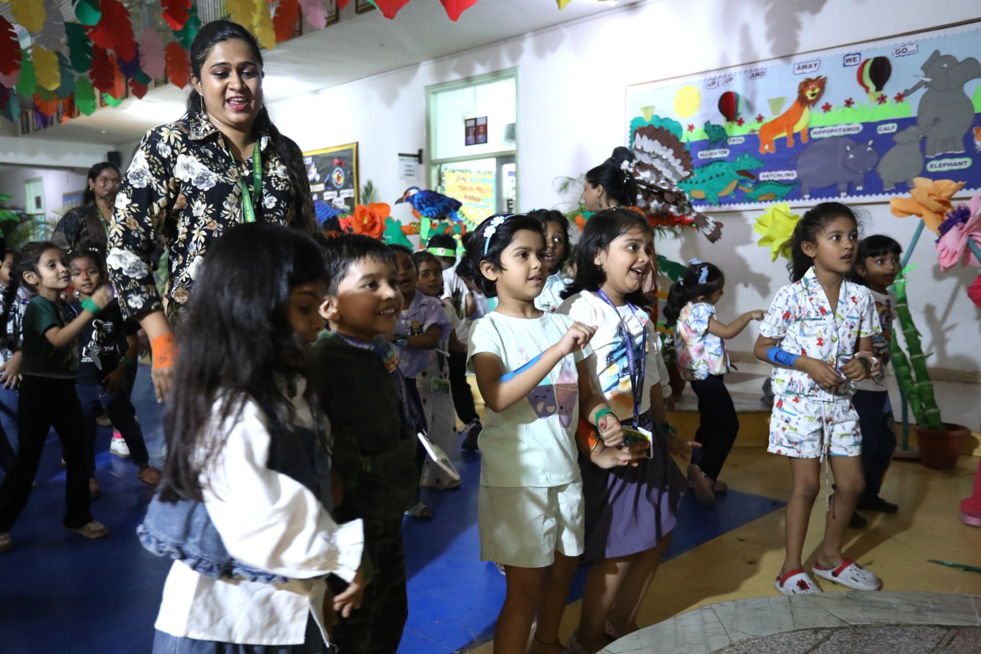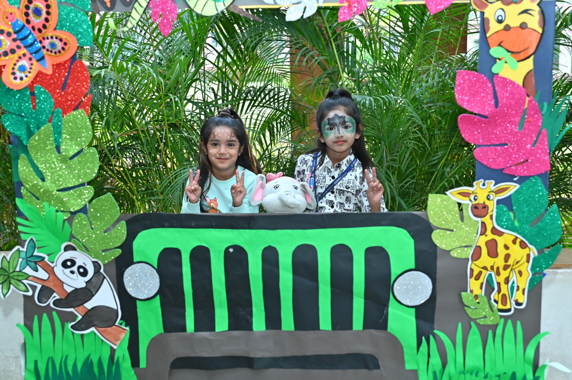 The campus was beautifully transformed into a vibrant jungle setting with green drapes, trees, animal cut-outs, jungle sound effects and soft lighting that created a magical forest ambience. The students were thrilled to see their school turn into a lively jungle and many arrived dressed as explorers and forest animals, which added to the excitement. The evening began with a warm welcome by the teachers followed by engaging activities such as Aim at the Lion, Crossing the River Challenge, hand band and tattoo making, puzzle solving, jungle expedition, shadow play and star gazing along with an energetic DJ session and bonfire.